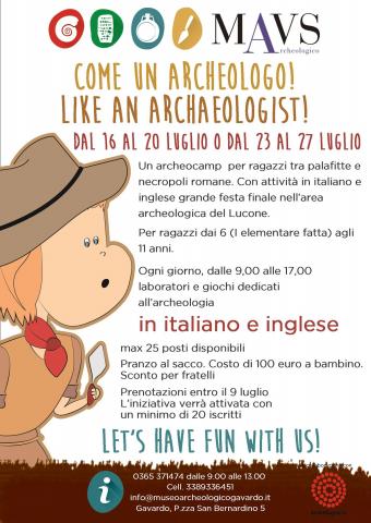 ARCHEOCAMP "Come un archeologo! Like an archaeologist!" . Per una settimana all'insegna dell'archeologia in italiano e in inglese, dai 6 agli 11 anni.