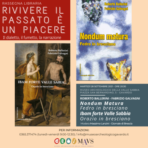 Per il primo appuntamento di questo ciclo, martedì 28 settembre alle ore 20:30 ci sarà la doppia presentazione dei volumi “Nondum Matura. Fedro in bresciano” e “Ibam forte Valle Sabbia. Orazio in bresciano”, a cura di Roberto Ballerini e Fabrizio Galvagni.