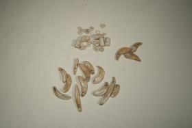 Collana o più collane composte da elementi di forma cilindrica o discoidale di calcare, di conchiglia (spondylus) e denti forati, sia di cinghiale che di lupo. Recinto A. Riparo della Corna Nibbia di Bione, Età del Rame.
