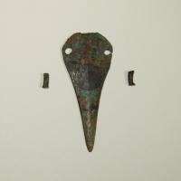 Lama di pugnale in bronzo con base arcuata e due fori con ribattini per l’aggancio della...