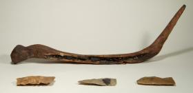 in legno, con lame in selce inserite in una scanalatura e trattenute da mastice. Lo strumento, utilizzato per mietere, presenta una sorta di appendice in legno che probabilmente serviva per radunare gli steli prima di tagliarli. Lucone A (scavo 1969)